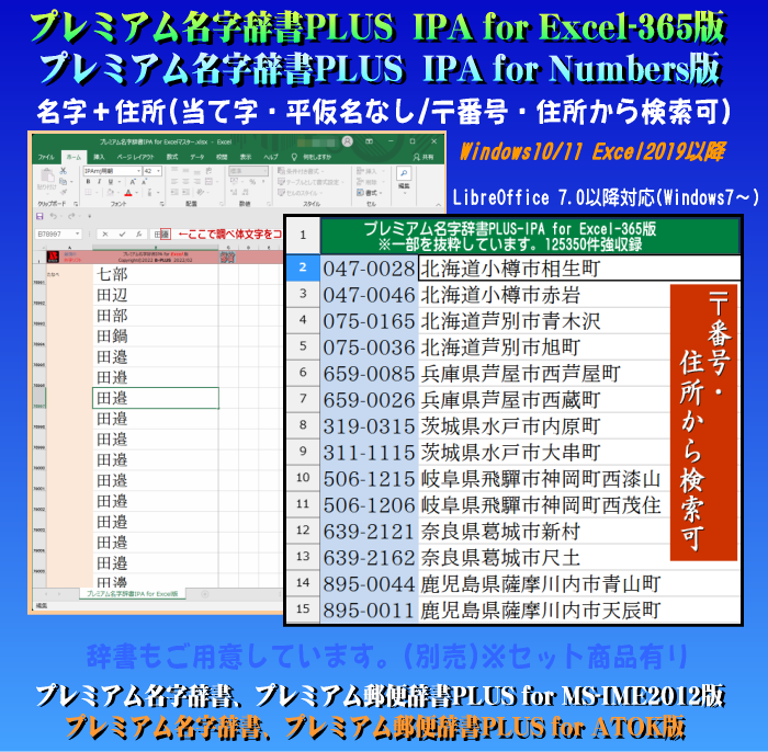 | プレミアム名字辞書IPA for Excel-365版 プレミアム名字辞書IPA for Numbers版 ※LibreOffice動作確認済み(7以降) Excel2019以降/Windows10以降 ※Excel2016はサンプル版で確認ください。 LibreOfficeでのご使用はWindows7以降 《お試し版を用意しています》※PLUS版です |